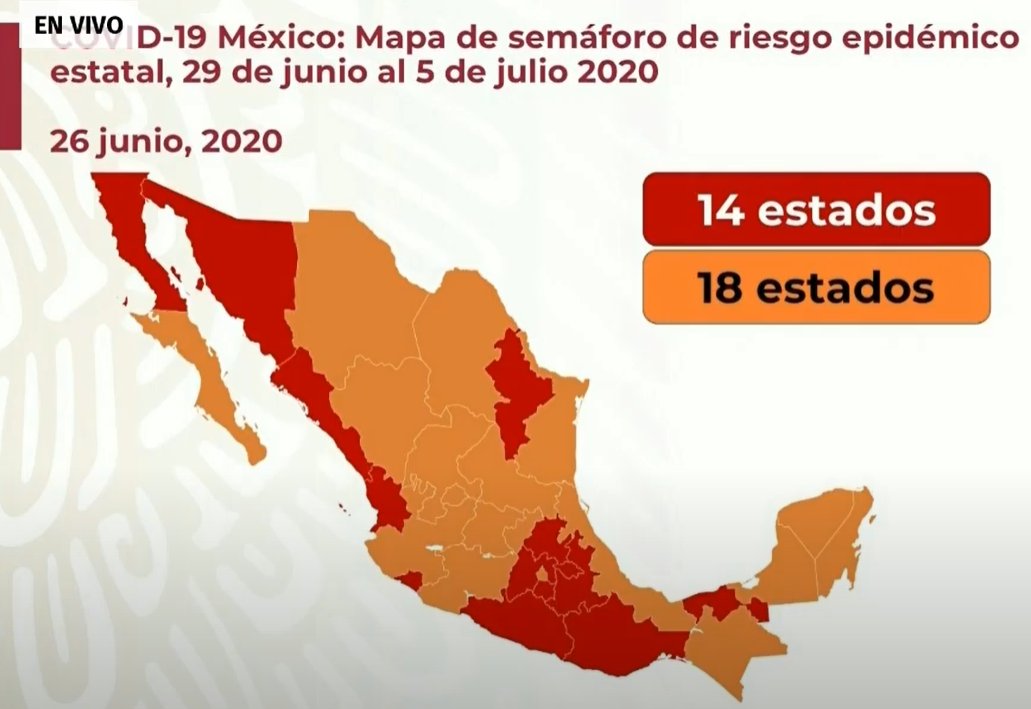 El Gobierno Federal vuelve a publicar el semáforo de la COVID-19. Malas noticias: Baja California Sur, Oaxaca, Jalisco, Colima, Zacatecas, San Luis Potosí, Querétaro, Yucatán y Quintana Roo regresan al confinamiento por un aumento de los casos. Hace 15 días esos Estados ya estaban en la fase naranja.